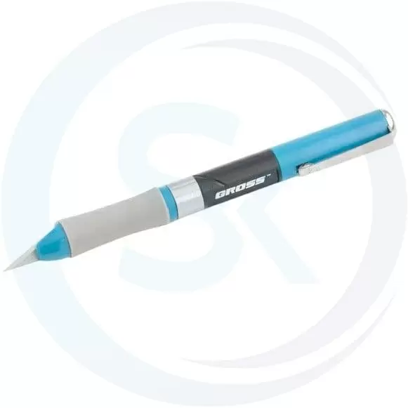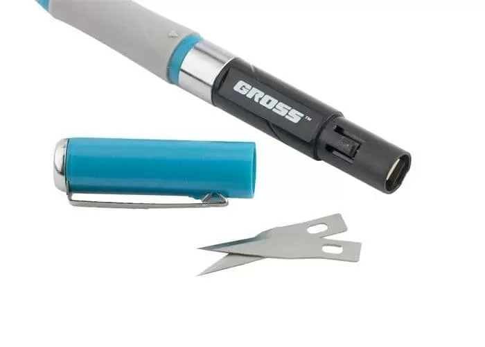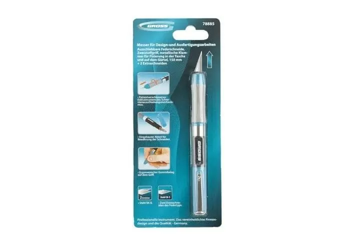 Нож для дизайна, выдвижное перовое лезвие, двухкомпонентная рукоятка, металлическая клипса для фиксации, 150 мм, 2 запасных лезвия Gross
