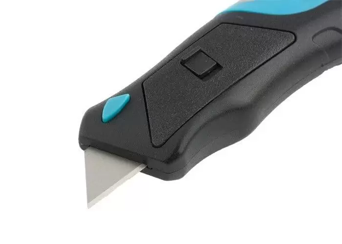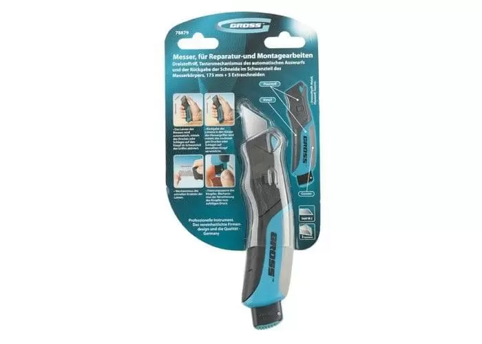 Нож ремонтно-монтажный, трехкомпонентная рукоятка, кнопочный автовыброс, возврат лезвия, 175 мм, 5 запасных лезвий Gross