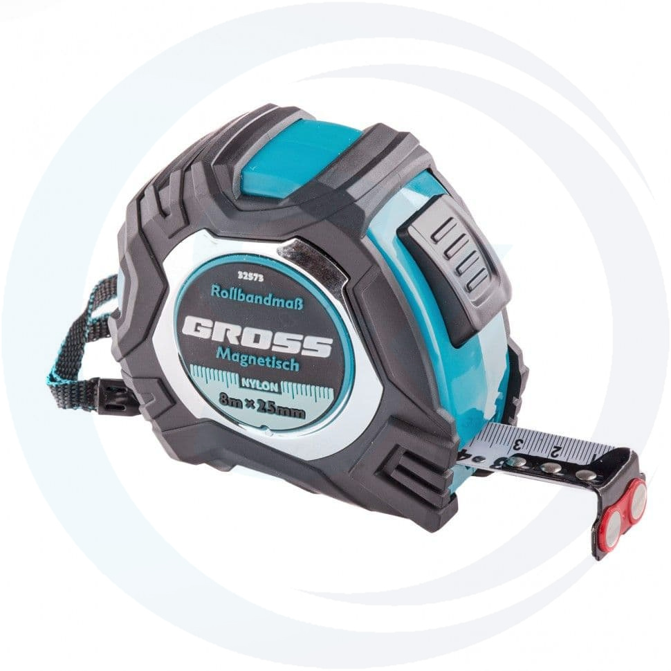 Рулетка Magnetisch 8 м х 25 мм, обрезиненный корпус, автоматическая фиксация, Нейлоновое покрытиеытие, зацеп с магнитом Gross подходит для людей любой квалификации в строительных, ремонтных работах и других задачах, где требуется точность и высокая работоспособность.