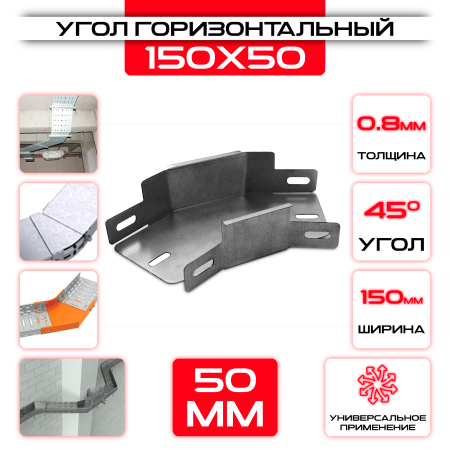 Угол горизонтальный 150x50мм, t=0,8мм, поворот 45° изготовлен из качественных материалов, обладает высокими прочностными характеристиками и долговечностью эксплуатации.