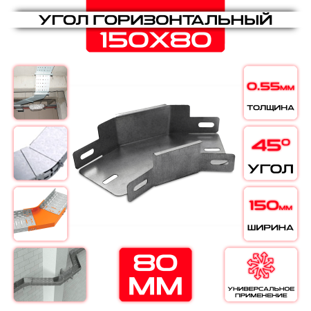 Угол горизонтальный 150x80мм, t=0,55мм, поворот 45° изготовлен из качественных материалов, обладает высокими прочностными характеристиками и долговечностью эксплуатации.