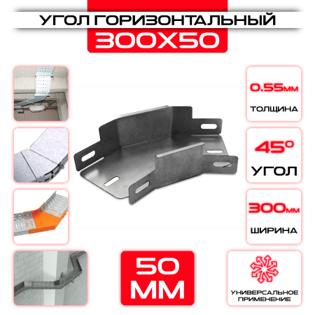 Угол горизонтальный 300x50мм, t=0,55мм, поворот 45° - это качественная и надежная деталь для строительства. Используется для создания надежных и прочных конструкций.