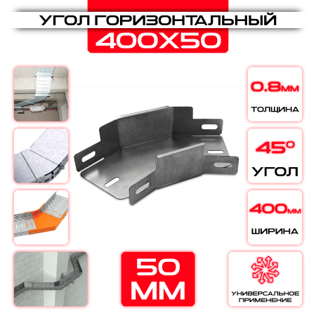 Угол горизонтальный 400x50мм, t=0,8мм, поворот 45° изготовлен из качественных материалов, обладает высокими прочностными характеристиками и долговечностью эксплуатации.