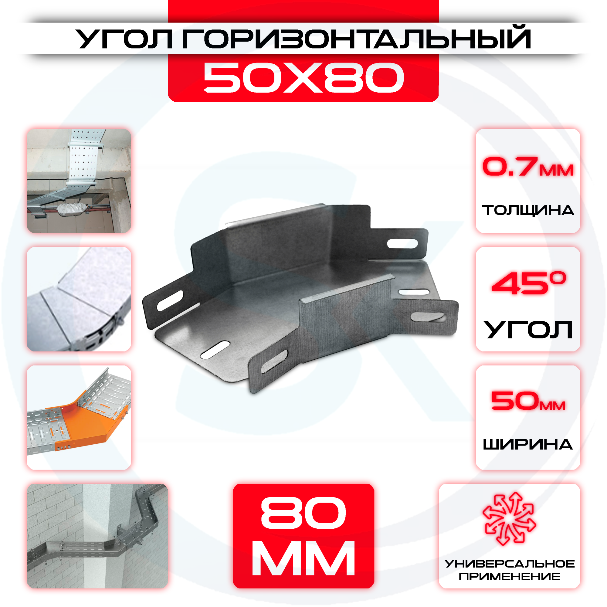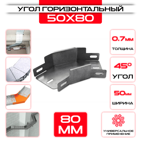 Угол горизонтальный 50x80мм, t=0,7мм, поворот 45° изготовлен из качественных материалов, обладает высокими прочностными характеристиками и долговечностью эксплуатации.
