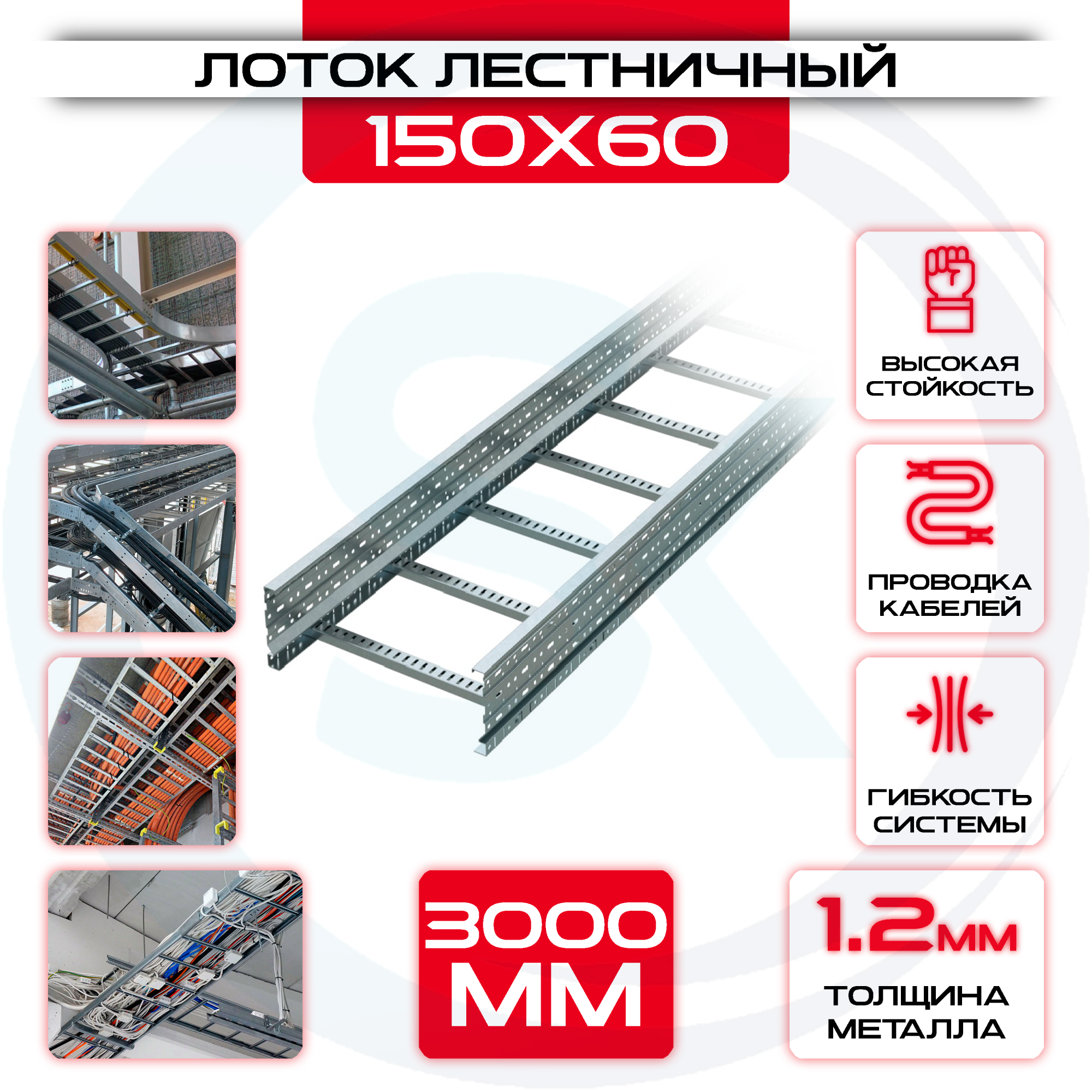 Лоток лестничный 150x60x3000 t = 1,2 мм произведен из качественных материалов, обладает высокими прочностными характеристиками и долговечностью эксплуатации.