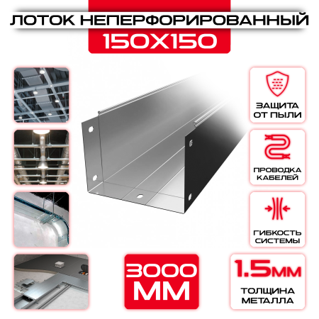 Лоток неперфорированный 150x150x3000 t = 1,5 мм изготовлен из высококачественных материалов, обладает высокими прочностными характеристиками и долговечностью эксплуатации.