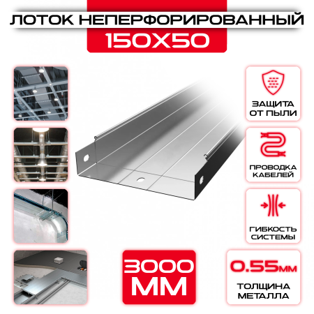 Лоток неперфорированный 150x50x3000 t = 0,55 – это удобное и надежное решение для организации кабельных систем. Изготовлен из прочной стали толщиной 0,55 мм, обеспечивает надежную защиту кабелей от воздействия окружающей среды.