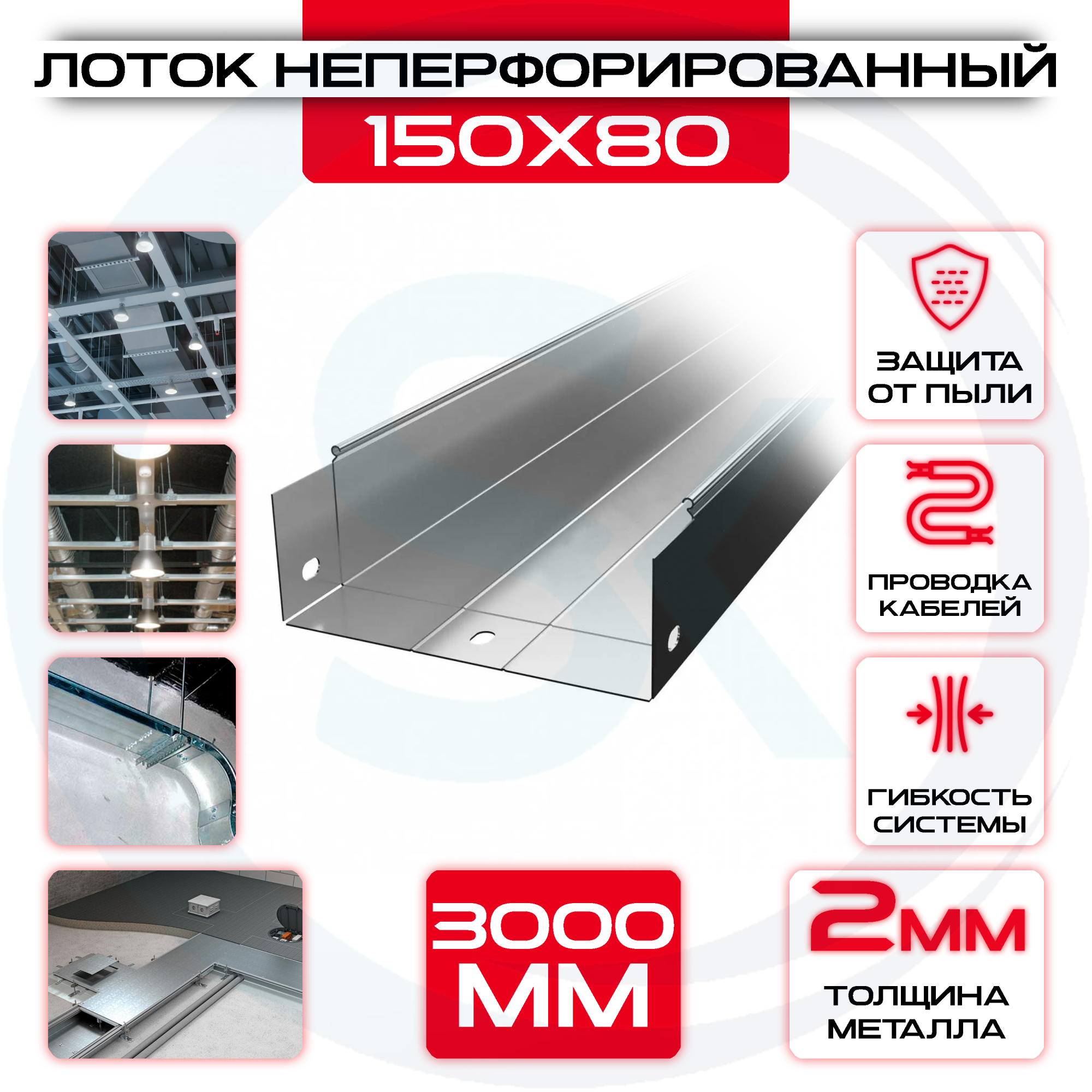 Лоток неперфорированный 150x80x3000 t = 2 мм изготовлен из качественных материалов, обладает высокими прочностными характеристиками и долговечностью эксплуатации.