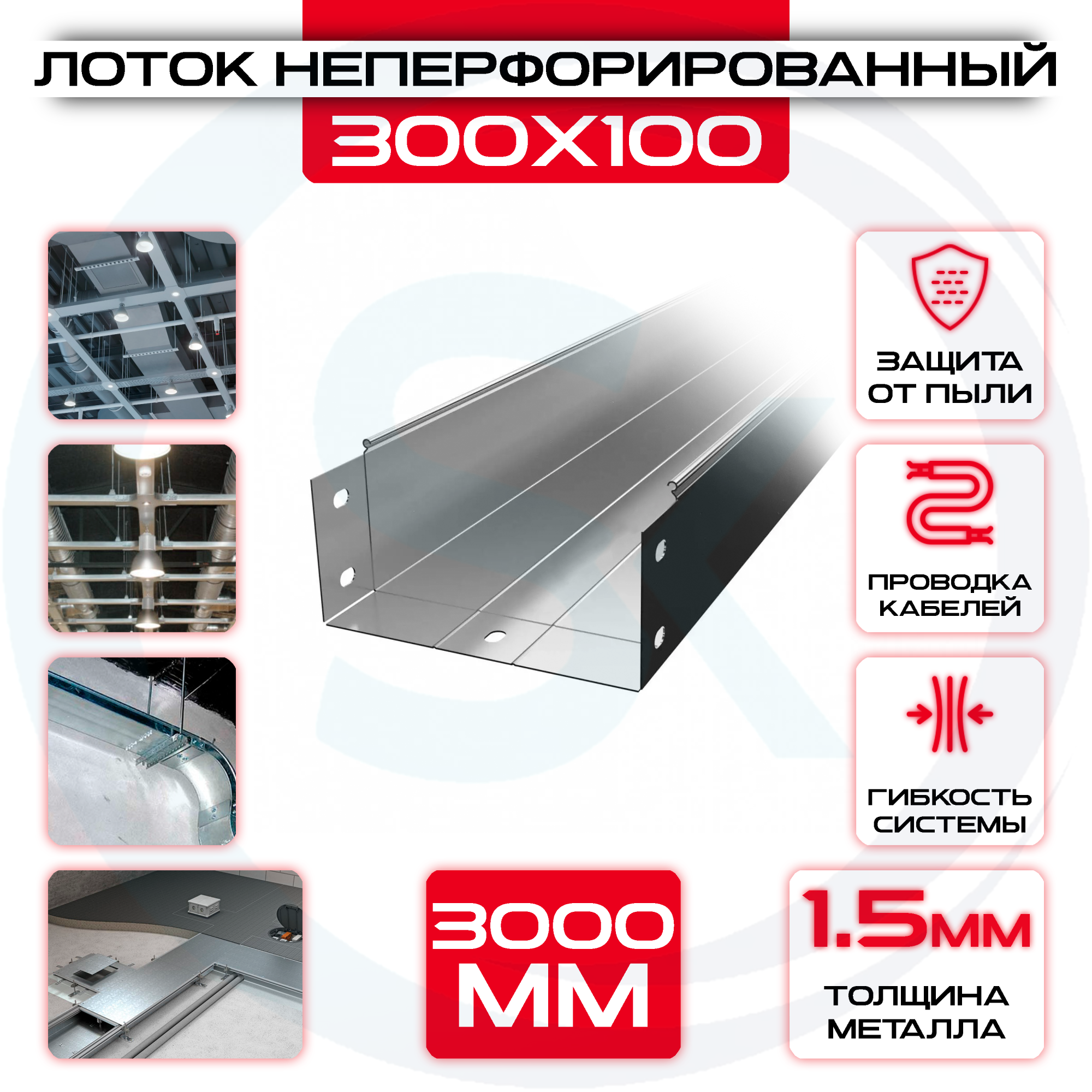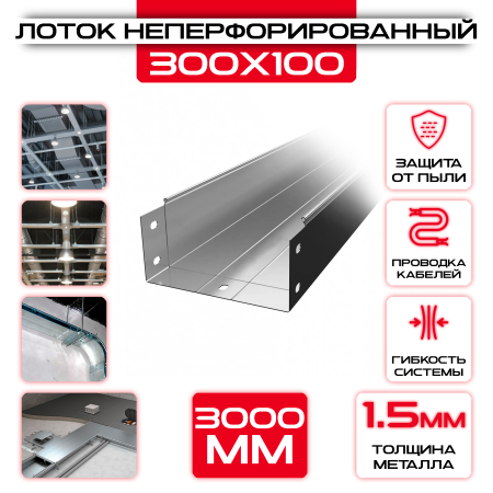 Лоток неперфорированный 300x100x3000 t = 1,5 мм