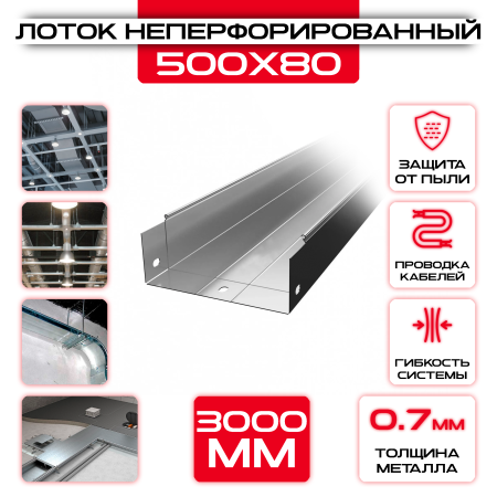 Лоток неперфорированный 500x80x3000 t = 0,7 - прочное изделие из металла, предназначенное для организации систем кабельного монтажа. Идеально подходит для прокладки кабелей и проводов внутри помещений или на улице. Гарантирует надежную защиту кабельных сетей и удовлетворяет всем требованиям безопасности и нормам качества.