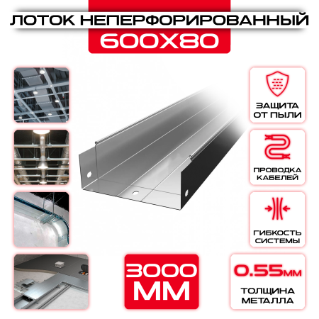 Лоток неперфорированный 600x80x3000 t = 0,55 - это удобное и надежное решение для организации кабельных систем. Изготовлен из высококачественного металла и имеет оптимальные размеры, позволяющие эффективно разместить и защитить провода и кабели.