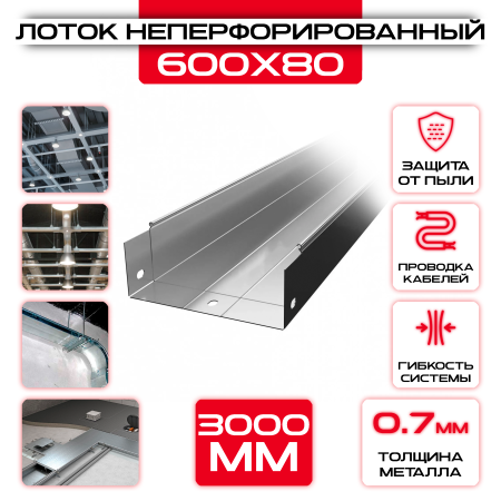 Лоток неперфорированный 600x80x3000 t = 0,7 - это удобное и надежное решение для организации кабельных систем. Изготовлен из прочного металла с толщиной стенки 0,7 мм.