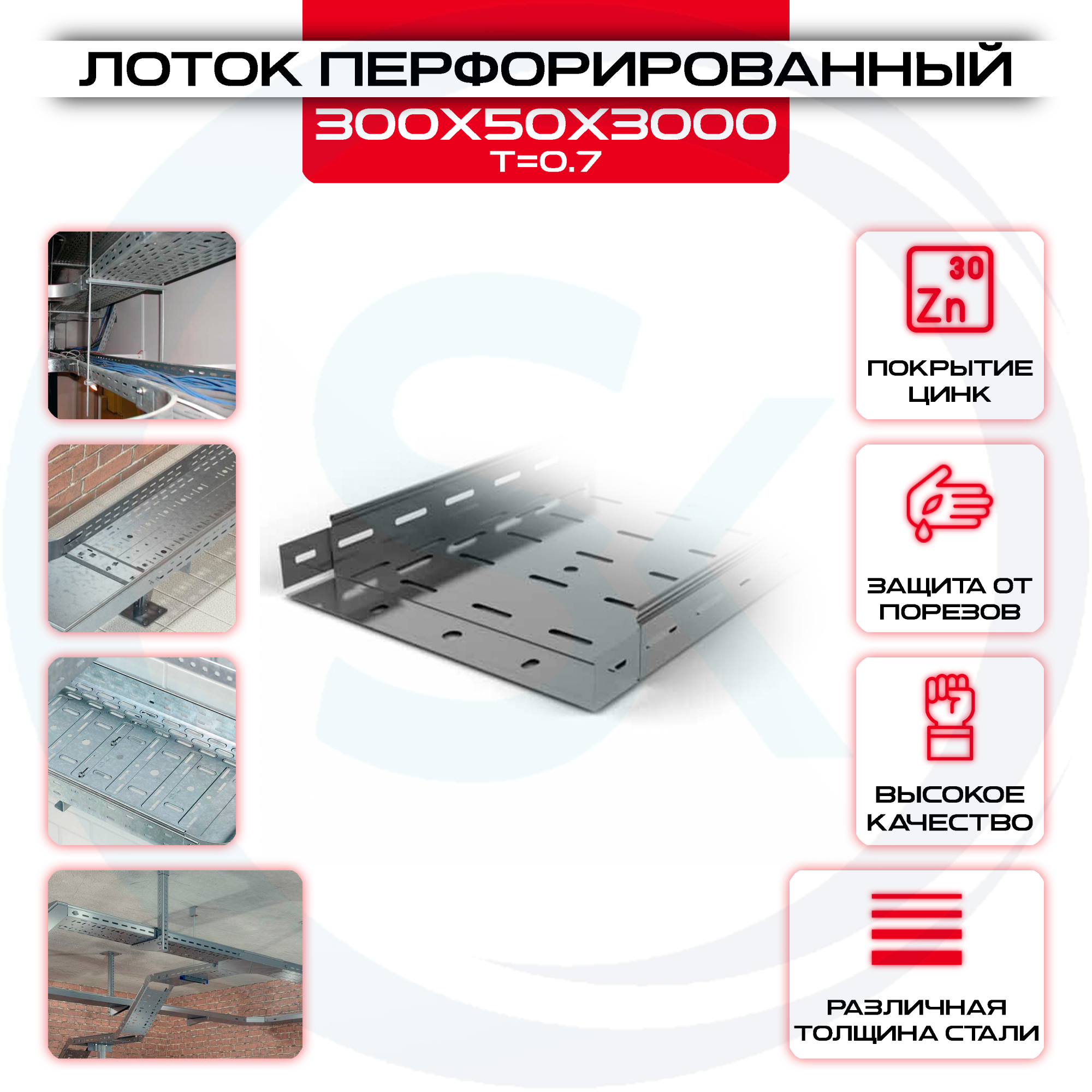 Лоток перфорированный 300х50х3000мм, t=0,7 оцинкованный изготовлен из высококачественных материалов, обладает высокими прочностными характеристиками и долговечностью эксплуатации.