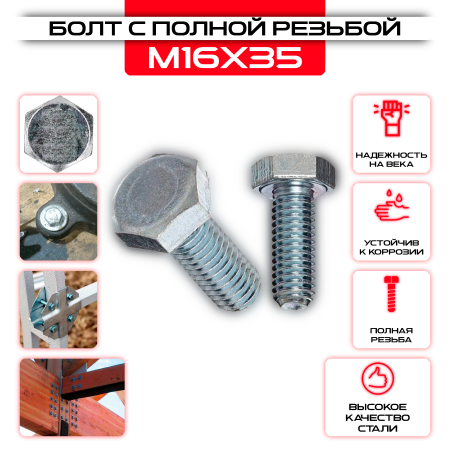 Болт с полной резьбой 16х35мм, DIN 933 изготовлен из прочного материала, обеспечивающего надежную фиксацию.Высокая прочность позволяют увеличить срок службы конструкции, в котором Болт с полной резьбой 16х35мм, DIN 933 служит креплением. Еще одним важным преимуществом является небольшой размер – благодаря этому он будет практически незаметен, что позволит сделать любой дизайн как в помещении, так и на улице.