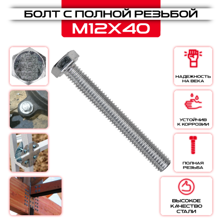 Болт с полной резьбой 12х40мм, цинк DIN 933