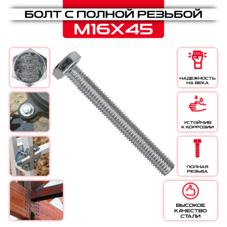 Болт с полной резьбой 16х45мм, цинк DIN 933