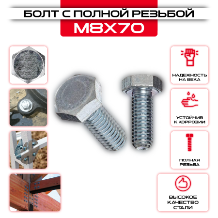 Болт с полной резьбой 8х70мм, цинк DIN 933 - это надежное и прочное крепежное изделие, применяемое в различных строительных и монтажных работах. Изготовлен из высококачественной стали с цинковым покрытием для защиты от коррозии. Обладает прекрасной нагрузочной способностью и стойкостью к воздействию внешних факторов. Идеально подходит для соединения металлических деталей в строительстве, машиностроении и других отраслях промышленности.