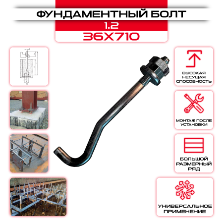 Болт фундаментный 1.2 36х710 – надежное крепление для строительных конструкций. Изготовлен из высококачественной стали, обладает повышенной прочностью и долговечностью. Имеет диаметр 36 мм и длину 710 мм. Отличается легкостью монтажа и устойчивостью к внешним воздействиям.