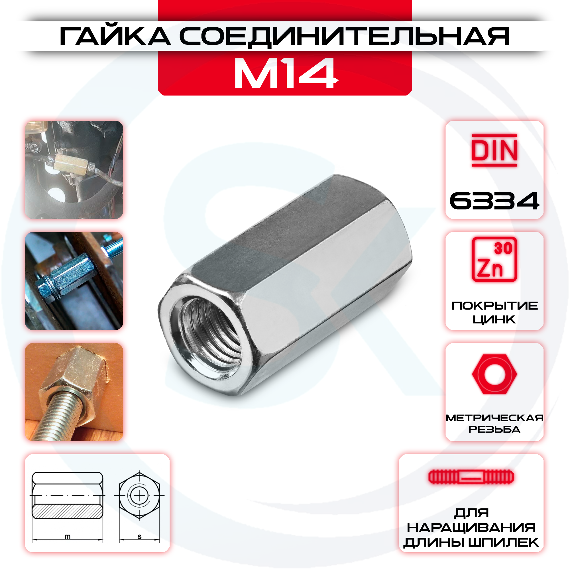 Гайка соединительная М14 удлиненная оцинкованная DIN 6334