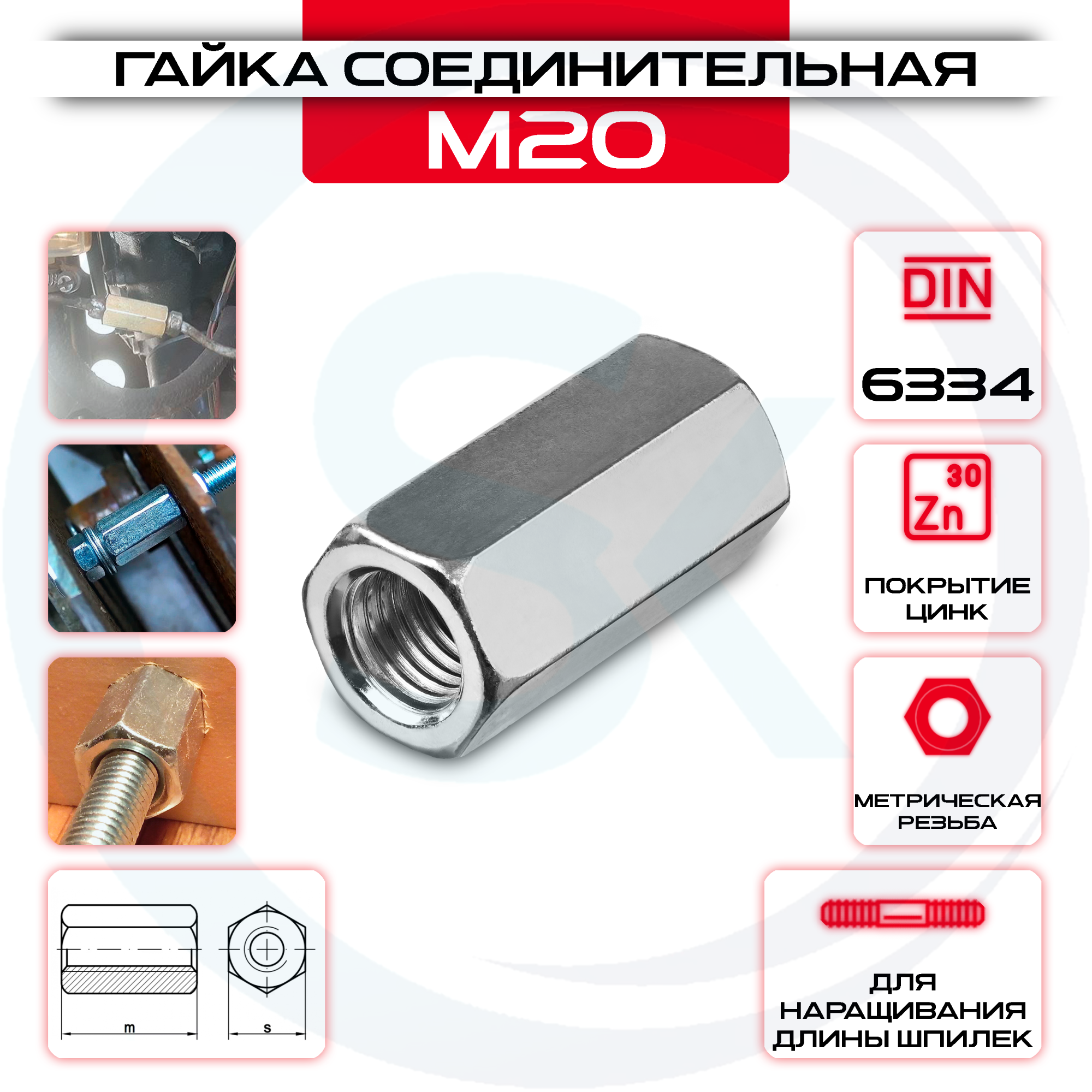 Гайка соединительная М20 удлиненная оцинкованная DIN 6334 - это качественный и надежный элемент крепежа, который предназначен для надежного соединения различных деталей или конструкций. Изготовлена гайка из оцинкованной стали, что обеспечивает ей высокую прочность и стойкость к коррозии. Удлиненное исполнение дает возможность легко и удобно соединять детали с большой толщиной или расстоянием между ними. Гайка соответствует стандарту DIN 6334 и обеспечивает надежное крепление. Это незаменимый элемент для различных строительных или монтажных работ.