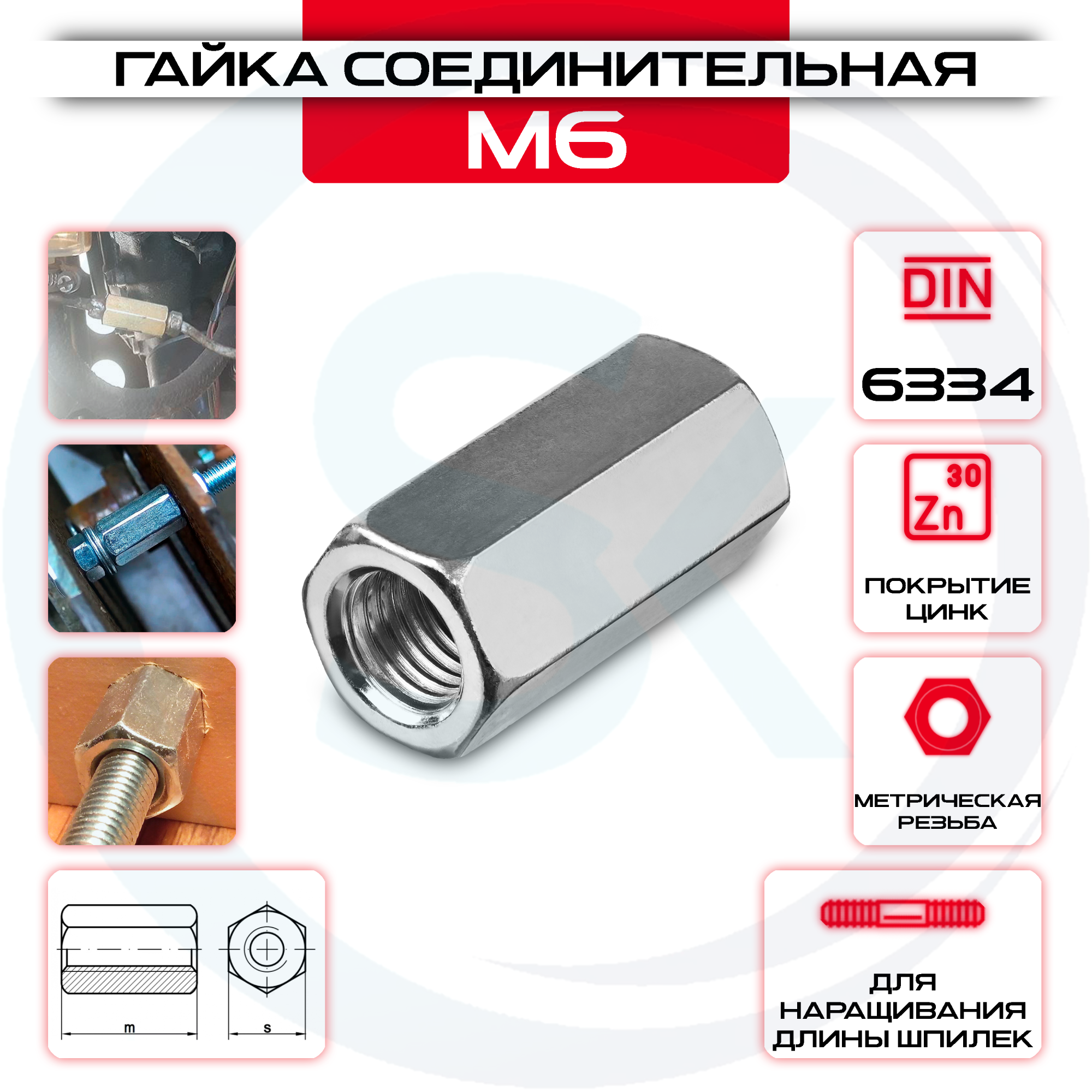 Гайка соединительная М6 удлиненная оцинкованная DIN 6334