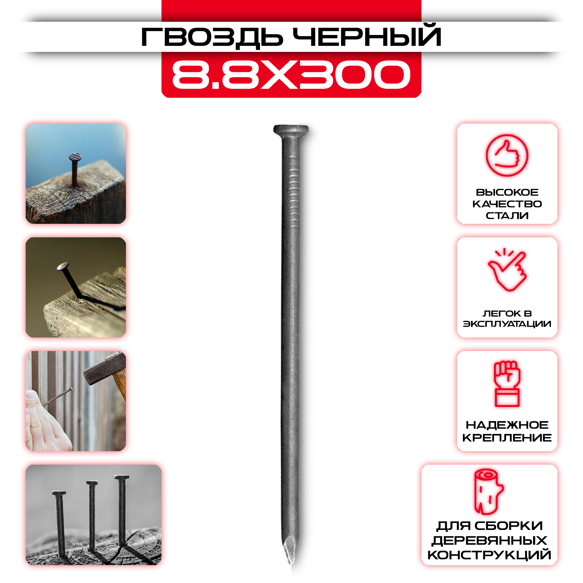 Гвозди строительные черные 8,8x300мм изготовлен из прочного материала, обеспечивающего надежную фиксацию.Высокая прочность позволяют увеличить срок службы конструкции, в котором Гвозди строительные черные 8,8x300мм служит креплением. Еще одним важным преимуществом является небольшой размер – благодаря этому он будет практически незаметен, что позволит сделать любой дизайн как в помещении, так и на улице.