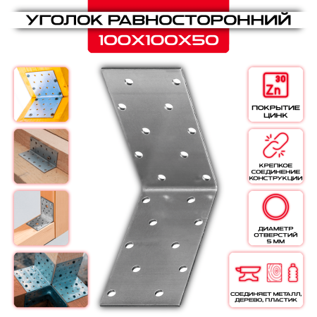 Крепежный уголок 100х100х50мм равносторонний KUR, толщина 2мм