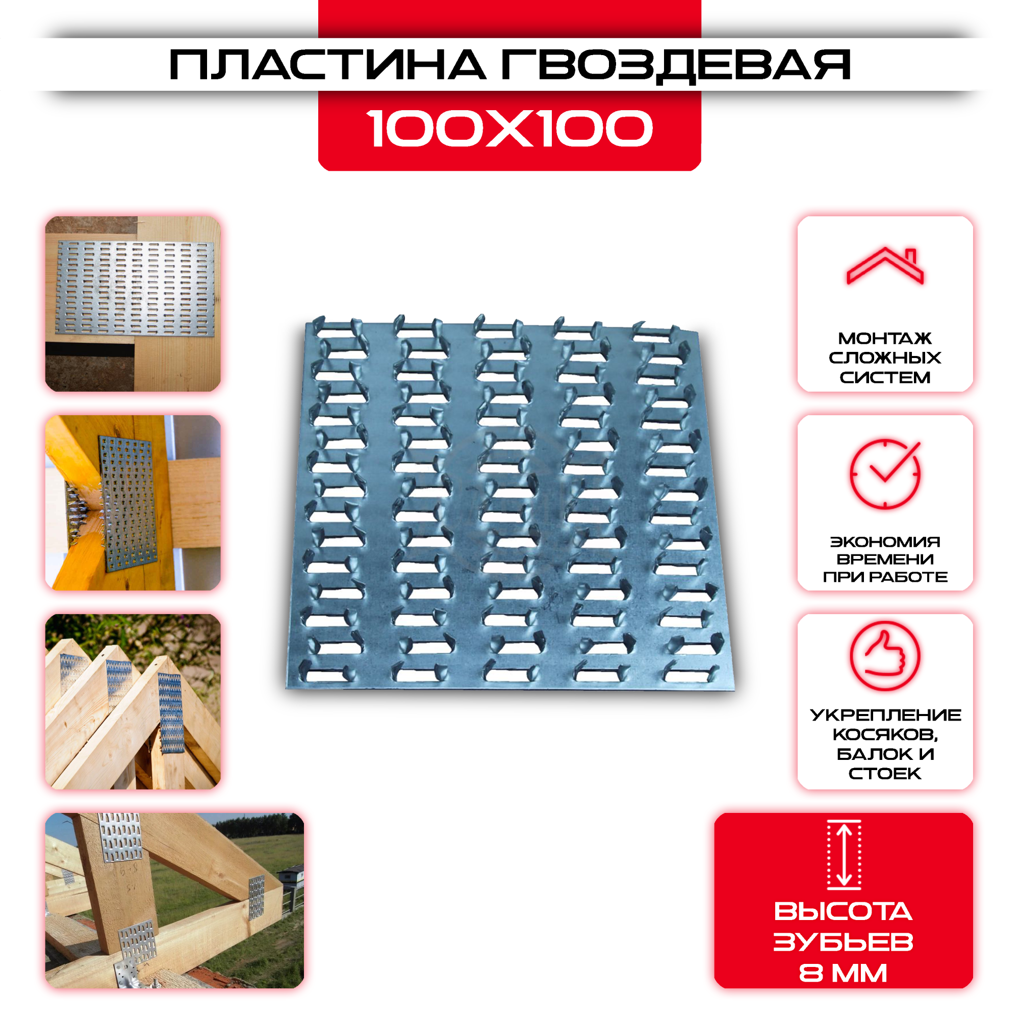 Гвоздевая пластина PG 100х100мм, толщина 0,9мм (высота 8мм) изготовлен из прочного материала, обеспечивающего надежную фиксацию.Высокая прочность позволяют увеличить срок службы конструкции, в котором Гвоздевая пластина PG 100х100мм, толщина 0,9мм (высота 8мм) служит креплением. Среди его преимуществ также можно отметить небольшой размер – благодаря этому он будет практически незаметен, что позволит сделать любой дизайн как в помещении, так и на улице.