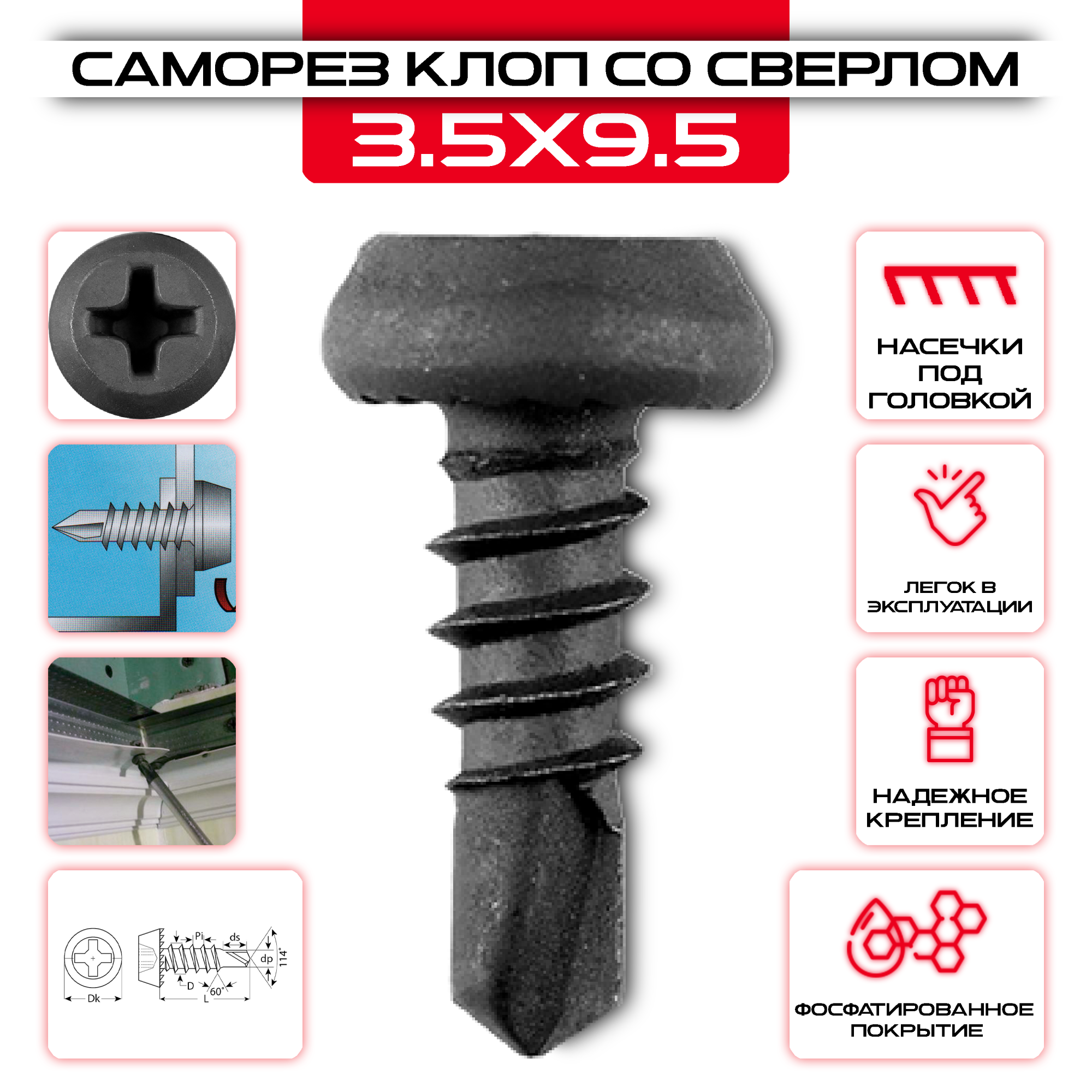 Саморез клоп 3,5х9,5мм, со сверлом изготовлен из прочного материала, обеспечивающего надежную фиксацию.Высокая прочность позволяют увеличить срок службы конструкции, в котором Саморез клоп 3,5х9,5мм, со сверлом служит креплением. Еще одним важным преимуществом является небольшой размер – благодаря этому он будет практически незаметен, что позволит сделать любой дизайн как в помещении, так и на улице.