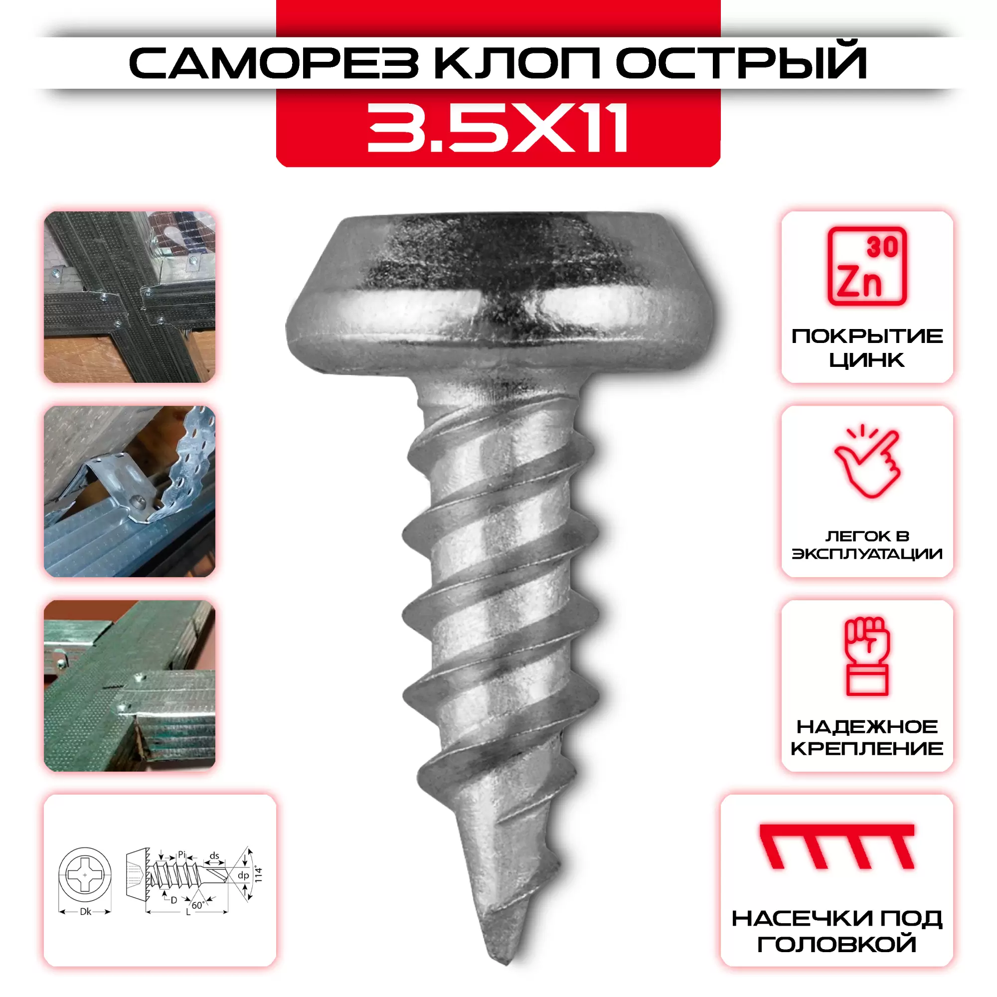 Саморез клоп 3,5х11мм, острый оцинкованный изготовлен из прочного материала, обеспечивающего надежную фиксацию.Надежная резьба позволяют увеличить срок службы конструкции, в котором Саморез клоп 3,5х11мм, острый оцинкованный служит креплением. Вторым его преимуществом является небольшой размер – благодаря этому он будет практически незаметен, что позволит сделать любой дизайн как в помещении, так и на улице.
