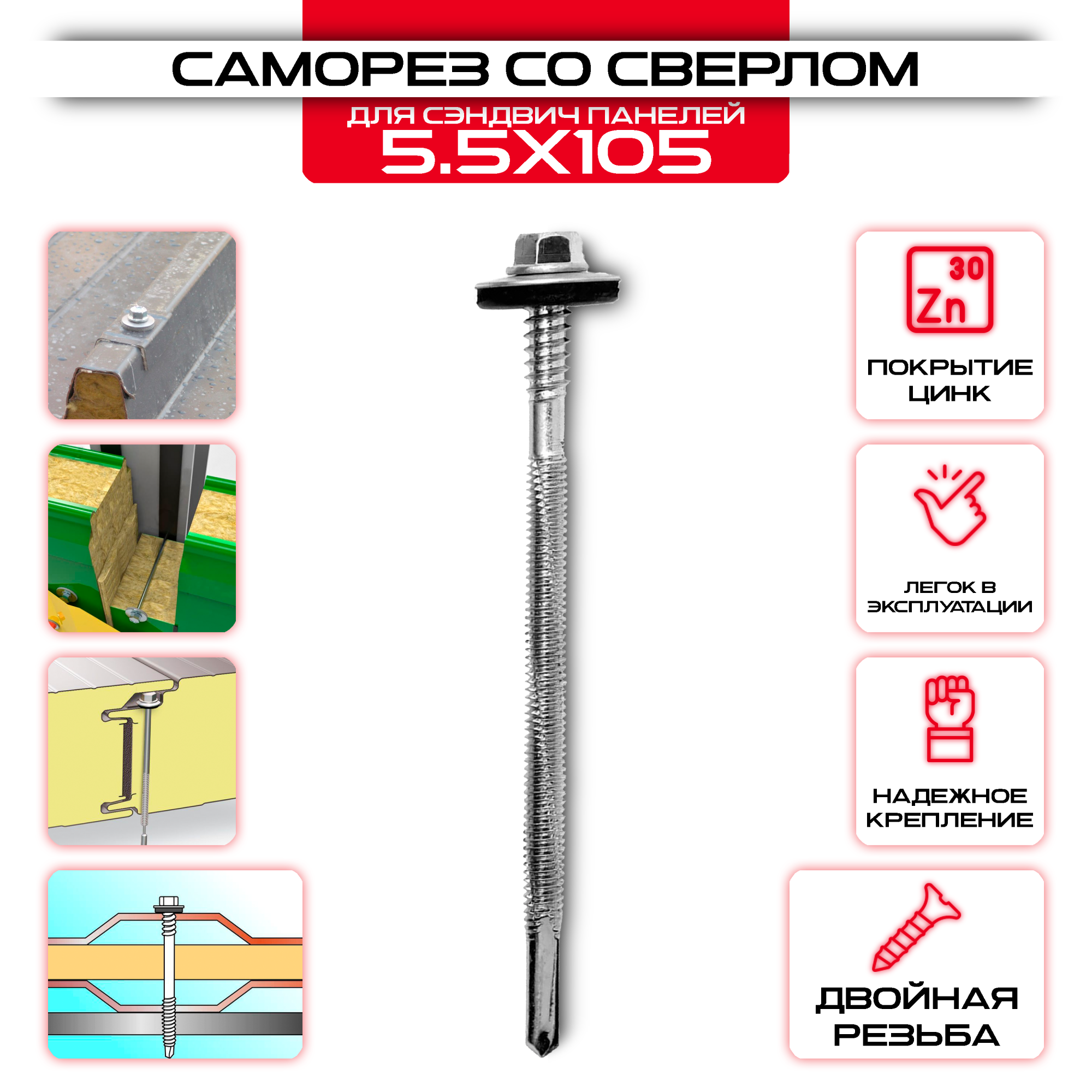 Продукт 'Саморезы для сэндвич панелей 5,5х105мм, с сверлом' предназначен для создания прочного и надежного крепления сэндвич панелей. Используется для соединения двух слоев панелей, обеспечивая надежную фиксацию. Саморезы имеют размеры 5,5х105мм, что обеспечивает оптимальное крепление и прочность соединения. Особенностью данных саморезов является наличие специального сверла, что позволяет с легкостью просверлить отверстие в сэндвич панеле, что упрощает и ускоряет монтаж. Продукт выполнен из высококачественной стали, что обеспечивает долговечность и стойкость к повреждениям. Удобная головка со специальными фланцами обеспечивает легкость и быстроту заворачивания саморезов. Эти саморезы являются незаменимым материалом при строительстве и ремонте сэндвич панелей.