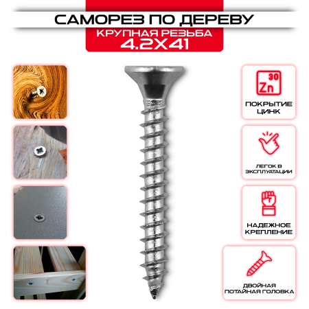 Саморез по дереву 4,2х41мм с крупной резьбой - надежное соединение деревянных конструкций. Отличается высокой прочностью и стойкостью к воздействию внешних факторов. Идеально подходит для использования в строительстве и ремонте.