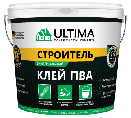 Клей ПВА ULTIMA Строитель ведро 0,9кг идеально подходит для ремонта и монтажа, а также для производства изделий из различных материалов.
