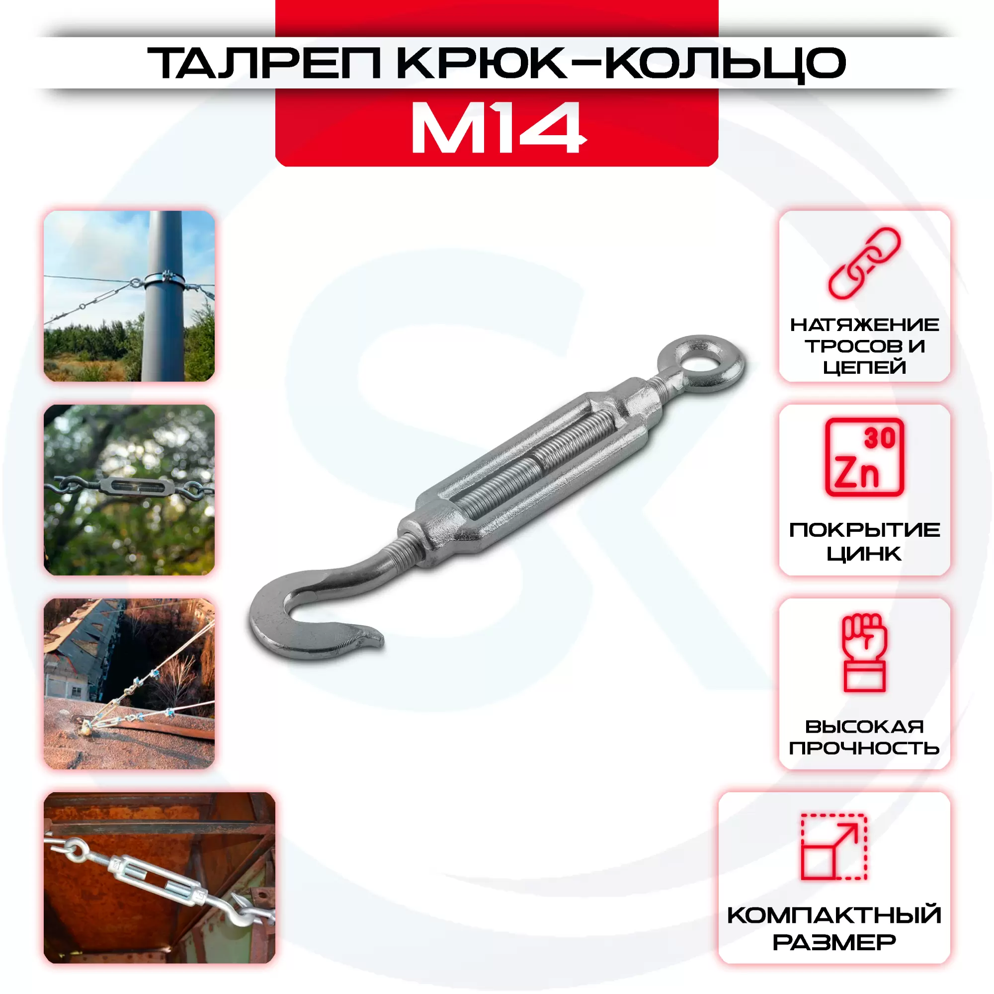 Талреп крюк-кольцо М14 мм, DIN 1480 оцинкованный - надежное и прочное крепление для различных конструкций. Идеально подходит для использования в строительстве, садоводстве и промышленности. Выполнен из оцинкованной стали, что обеспечивает защиту от коррозии и долговечность. Легко устанавливается и обеспечивает надежную фиксацию. Прост в использовании и удобен в транспортировке.